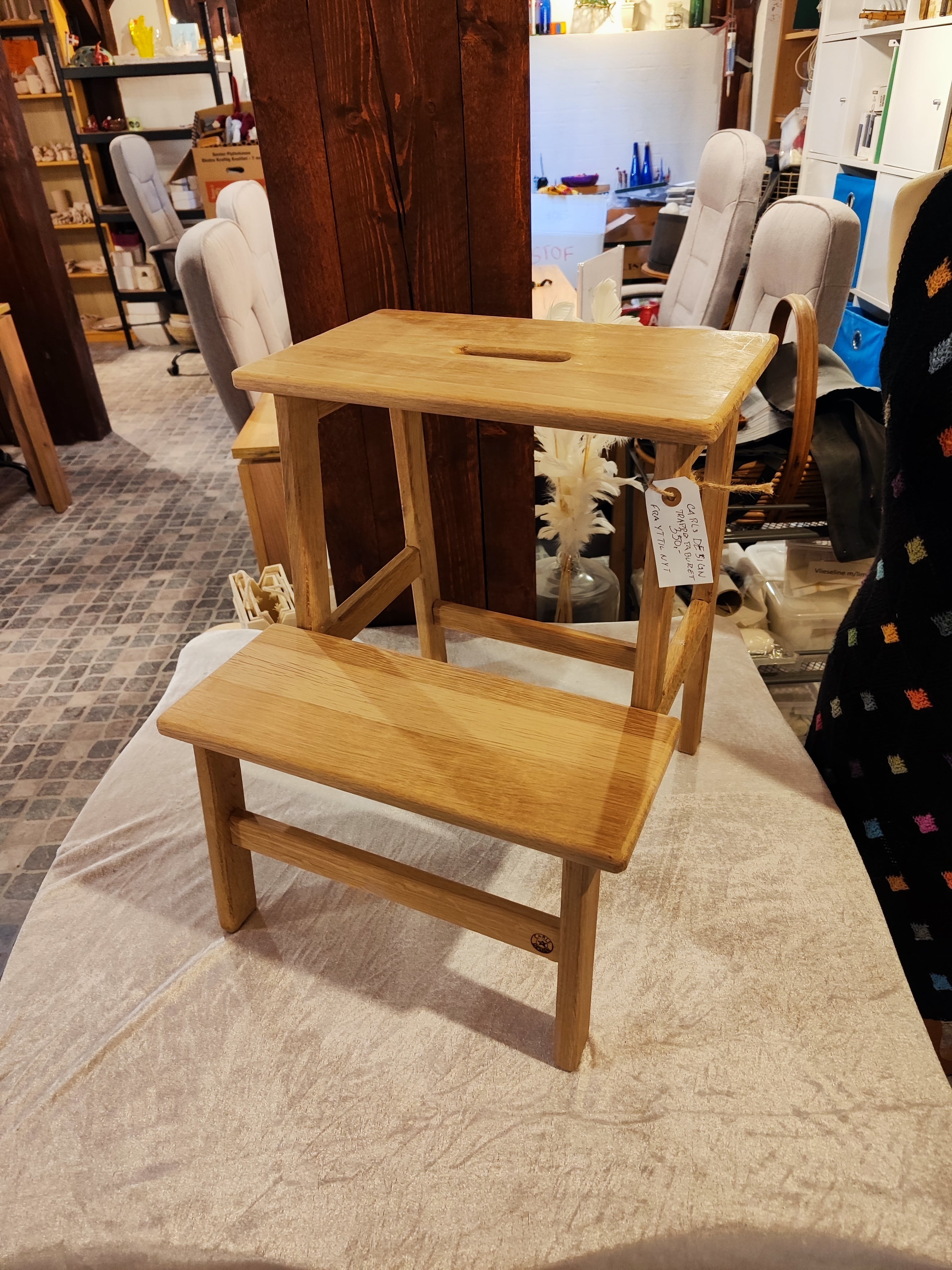 Taburet i genbrugsegetræ med to trin. Højde 50cm.